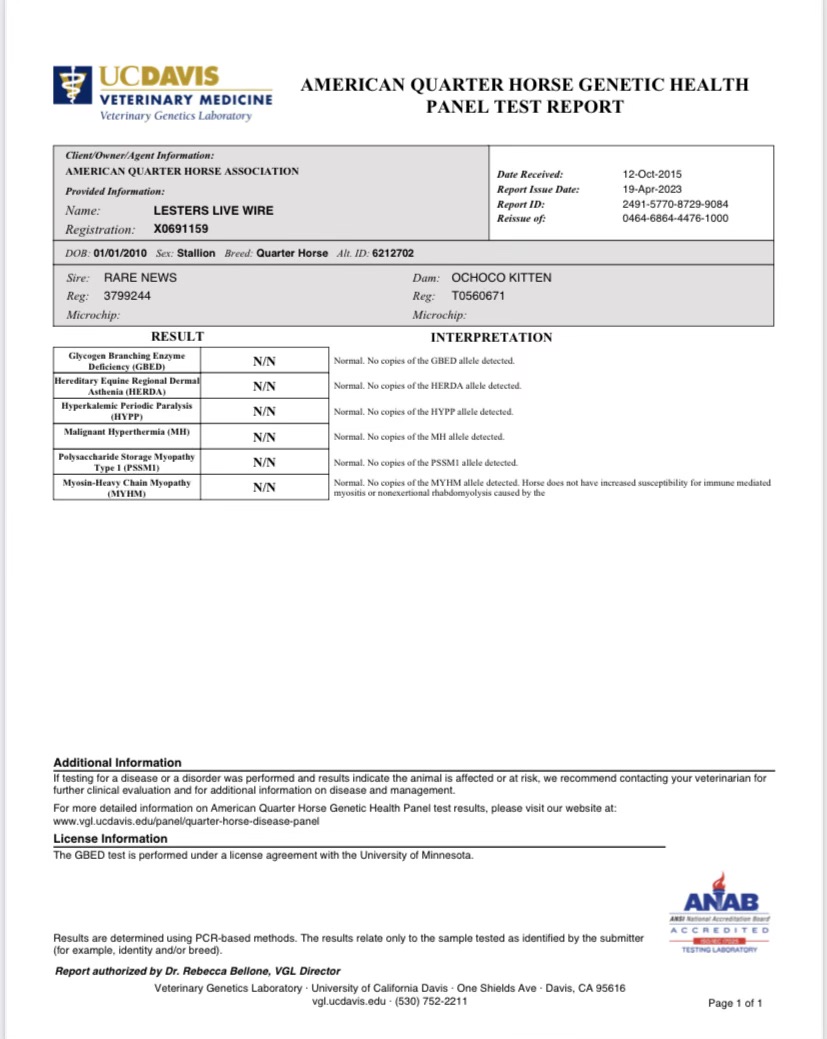 Lester Ranches and Lori Lester are proud to offer Lester's Live Wire a 2010 AQHA stallion with the size, speed, and athletic ability suitable for many disciplines. Tuffy is already siring versatile horses for not only barrel racing but ranch work, roping and the show ring. His size and good bone structure matches perfectly with his kind disposition that foal owners are raving about. An injury early on prevented him from competing but he had been on track to futurity in the barrel pen and showed great speed and talent. If you are looking for a stallion to add size, speed, and trainablity Lesters Live Wire is a great choice.
